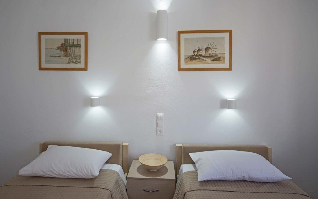 15sqm with twin beds with the ability to unite to become a double on request. This room is on the front of the building with its own staircase entrance and has a veranda . On the veranda there is a table with two chairs for relaxation.